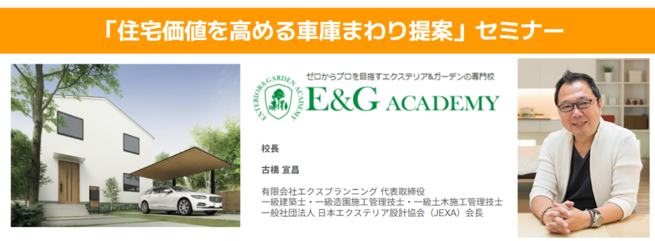 この度 エクステリア&ガーデンアカデミー 校長 古橋 宜昌 様を講師として、「住宅価値を高める車庫まわり提案」 セミナーをZOOM開催させていただく運びとなりました。