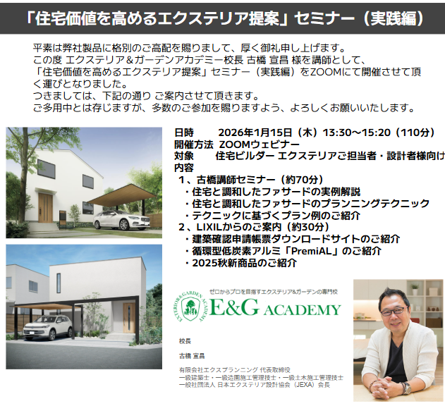 この度 エクステリア&ガーデンアカデミー 校長 古橋 宜昌 様を講師として、「住宅価値を高めるエクステリア提案」セミナー(実践編)をZOOM開催させていただく運びとなりました。