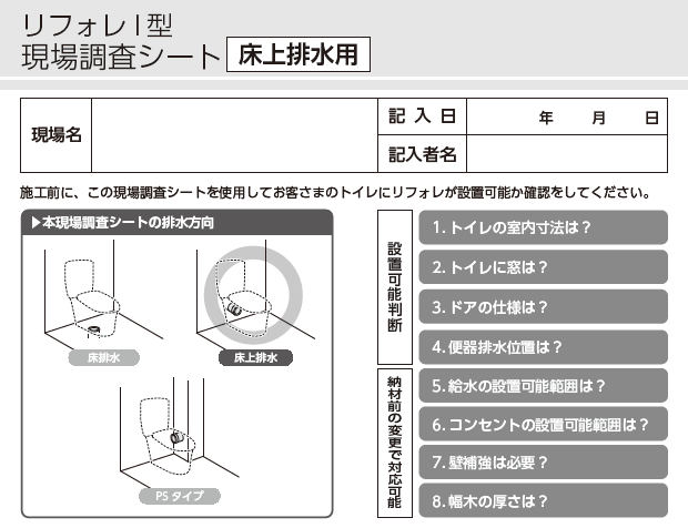 施工前に、リフォレが設置可能かどうか確認するための資料です(床上排水用)