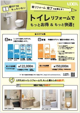 補助金効果により「窓リフォーム」を実施されたOB客様が増えていらっしゃるのではないでしょうか。このチラシは、【窓リフォームを完了された方】にお渡しいただくだけで簡単に【トイレリフォーム】をご提案いただけるツールです。様々な場面でOB客様にお渡しいただき、セカンドリフォーム受注の一助としてご活用いただけますと幸いです。 <掲載内容>●トイレリフォームの省エネ効果額●リクシルのお得なキャンペーン●商品特長をコンパクトにご紹介しております。