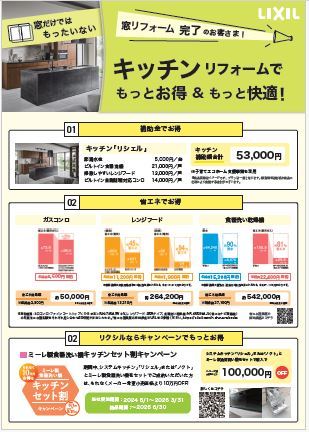 補助金効果により「窓リフォーム」を実施されたOB客様が増えていらっしゃるのではないでしょうか。このチラシは、【窓リフォームを完了された方】にお渡しいただくだけで簡単に【キッチンリフォーム】をご提案いただけるツールです。様々な場面でOB客様にお渡しいただき、セカンドリフォーム受注の一助としてご活用いただけますと幸いです。 <掲載内容> ●キッチンリフォームの補助額(子育てエコホーム支援事業)●省エネ効果額●リクシルのお得なキャンペーン●商品特長をコンパクトにご紹介しております。