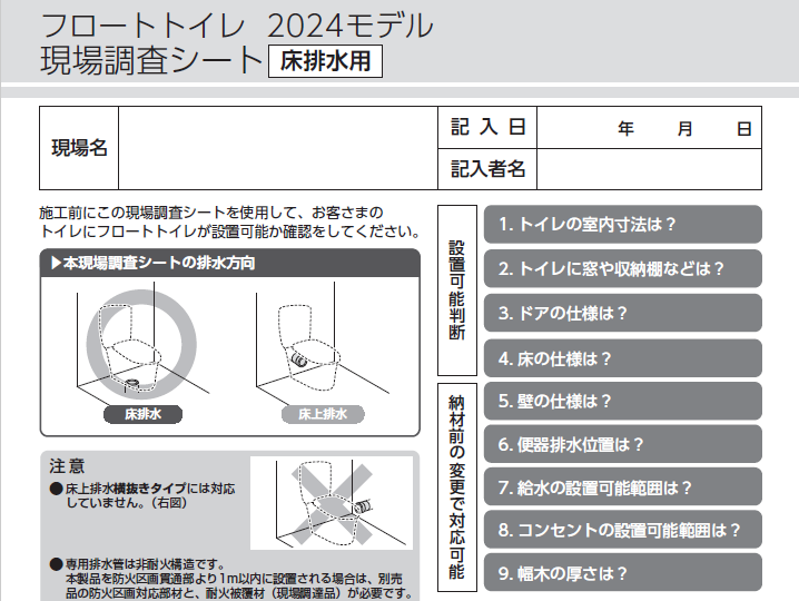 施工前に、フロートトイレが設置可能かどうか確認するための資料です