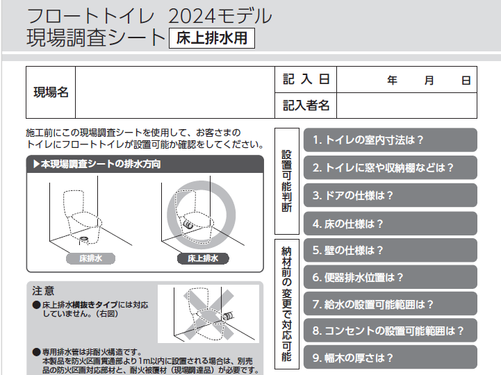 施工前に、フロートトイレ(床上排水)が設置可能かどうか確認するための資料です