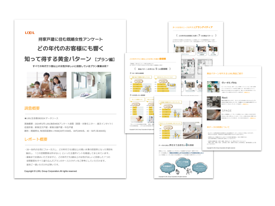 ・最後までお読みいただきますと、どの年代でも3割以上の女性がほしいと回答した7つの空間要素をすべて盛り込んだプランのケーススタディをご参考にしていただけます。是非ご一読いただければ幸いです。