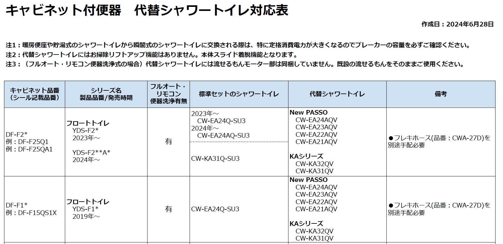 キャビネット付便器で取り替えるためのシャワートイレの一覧表になります。