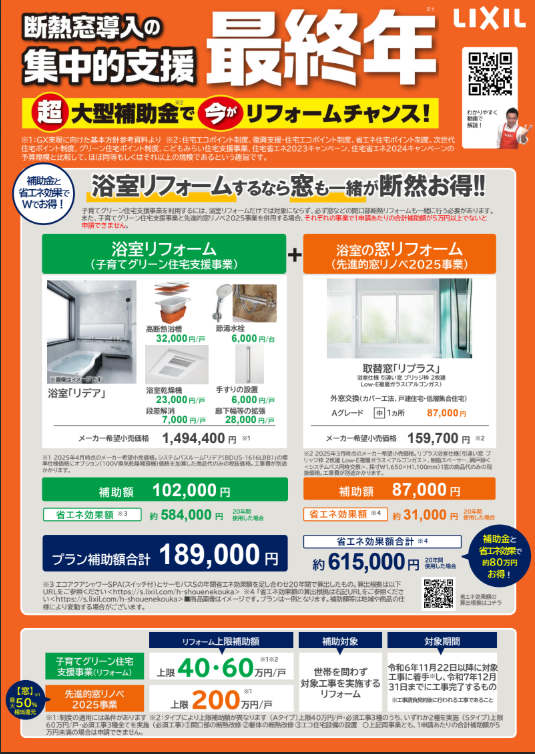「先進的窓リノベ2025事業」「子育てグリーン住宅支援事業」を活用したリフォーム補助金獲得プラン例(補助額)、省エネ効果額、窓リフォームのメリット、LIXILおすすめ商品等をご提案頂けるチラシです。浴室リフォーム(子育てグリーン)+窓リフォーム(先進的窓リノベ2025)プランをベースにご提案しております。