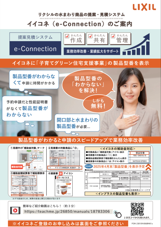 リクシルの水まわり商品の提案・見積システムイイコネ(e-Connection)についてご案内するチラシです。