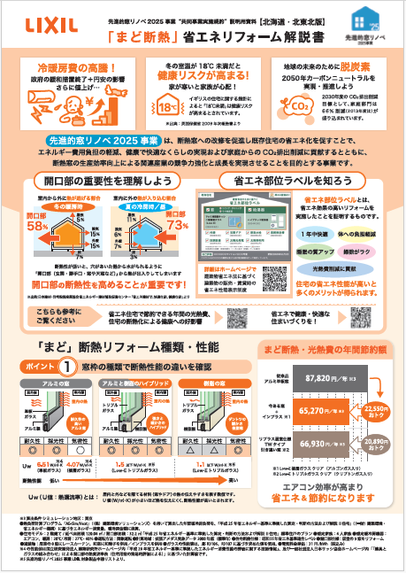 【北海道・北東北版】裏面_外窓交換商品リフレム掲載。先進的窓リノベ2025事業 共同事業実施規約を締結する際の説明用資料です。共同事業実施規約において説明が必要な、①省エネ効果・②省エネ部位ラベル・③アンケートへのご協力について、こちらのチラシ1枚で行えるようになっております。