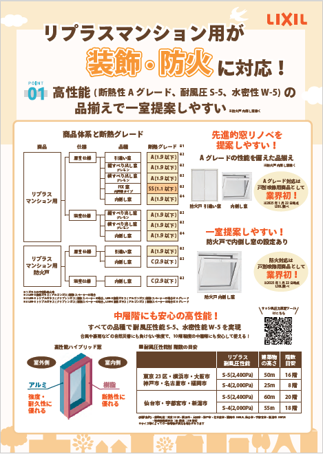 事業者様向け「リプラスマンション用提案チラシ」です。防火もラインナップされ、窓リノベAグレードが取れる他社優位性の高い商品です。商品体系や断熱グレード 、施工性、現場対応しやすい有償品などを掲載しております。