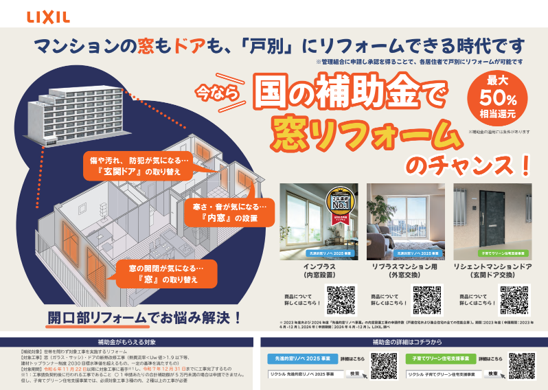 国の補助金で窓リフォームのチャンス!マンションの窓もドアも、「戸別」にリフォームできる時代です!