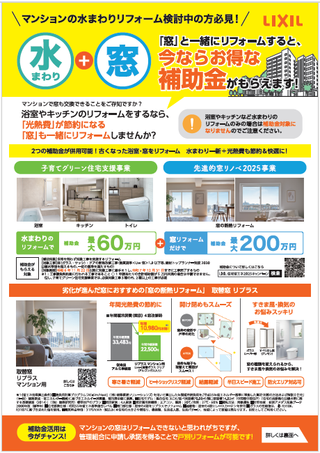 マンションの水まわりリフォーム検討中のお客さまに 「窓」と一緒にリフォームすると補助金がもらること、お得にリフォームできることをご提案できるチラシです。