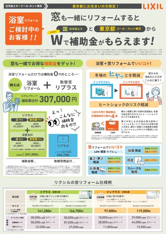 浴室の見積り提出時に、浴室RFの見積説明から自然な流れで窓の追加提案を行っていただけるチラシです。新たにクール・ネット東京の内容を追加しておりますので、ぜひご活用ください。
