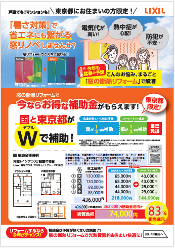 東京都にお住まいの方限定、クール・ネット東京と窓リノベ補助金をダブルでご案内いただけるチラシです。「電気代が高い!」「熱中症が心配!」「防犯が不安・・・」こんなお悩み、まるごと「窓の断熱リフォーム」で解消!!お得なこの機会に、ぜひ窓+水まわりの断熱リフォームをご提案ください。 ※材工価格を編集してご利用ください。