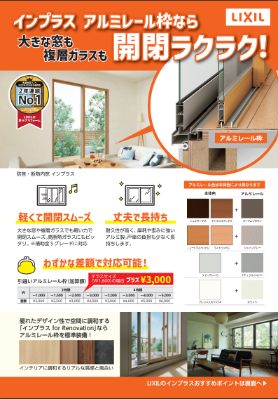 内窓の常識が変わる!LIXILインプラス『アルミレール仕様』をご提案いただけるチラシです。 特大サイズでも開閉ラクラク。Low-E標準化で提案力が劇的に向上します。