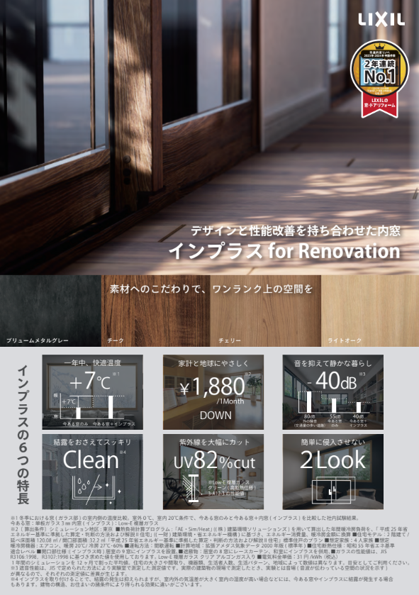 デザイン・性能面を向上したインプラス for Renovationの拡販にご活用ください。インプラスの6つの特徴、施工事例、UserVoiceなどが掲載されております。