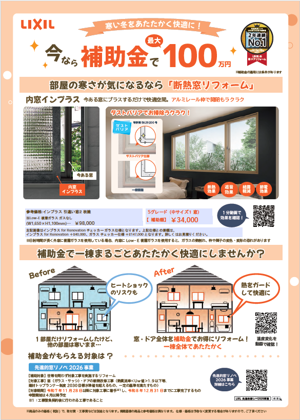 断熱・防犯をセットで叶える開口部リフォームの2026補助金ご提案チラシです。