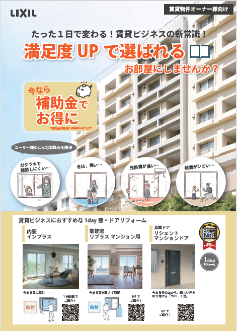 賃貸ビジネスにおすすめな1day 窓・ドアリフォームご提案チラシです。
