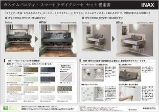 「カウンター洗面 カスタムバニティ」に「スマートモザイクシート」をプラス。タイルがワンポイント加わるだけで、空間が華やかな印象に!